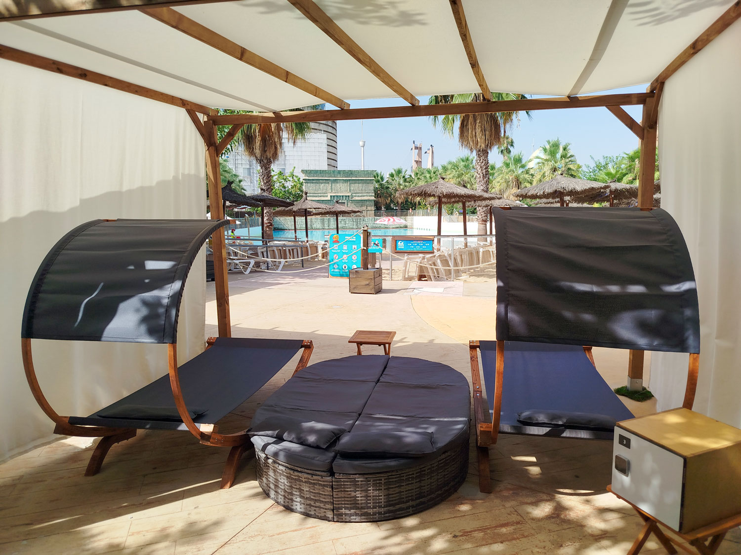Disfruta de un espacio único, acotado y reservado junto a la zona de Playa Quetzal, donde hasta 4 personas pueden hacer uso de cama balinesa y tumbona bajo ventilador.