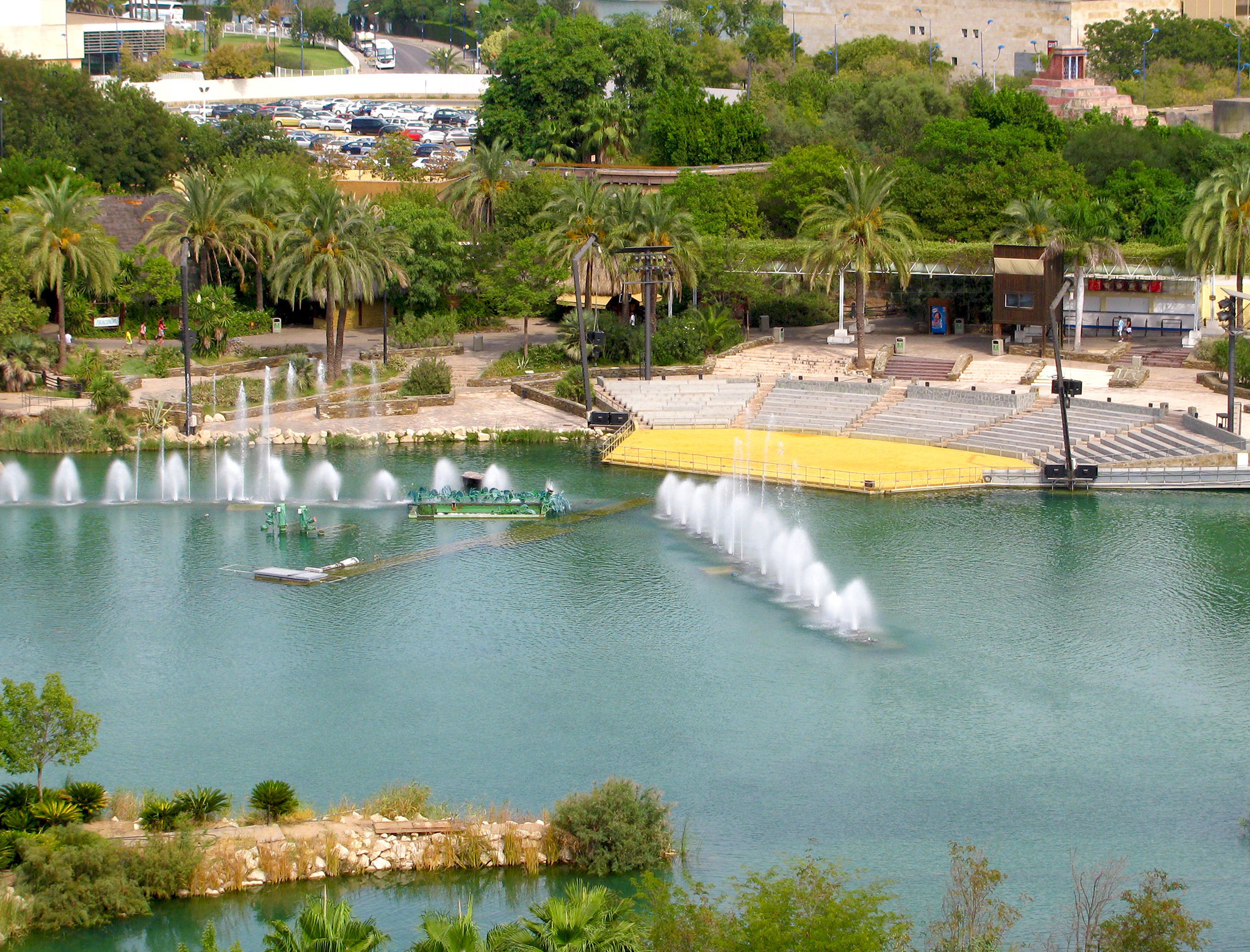 Tras el escenario, una gran lámina de agua donde se encuentran los medios técnicos como: fuentes cibernéticas, pantalla de agua, fuego, puntos de lanzamiento de fuegos artificiales, etc. Adecuado para presentaciones de grandes productos en forma de espectáculo multimedia.