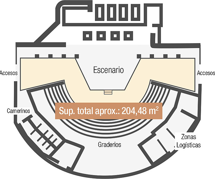 • Graderio de madera semicircular / Escenario en forma de trapecio elevado 60 cm. sobre el suelo.