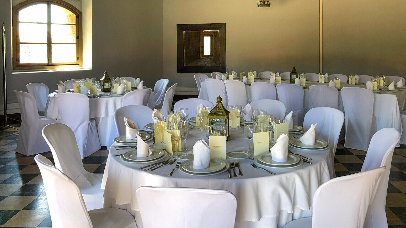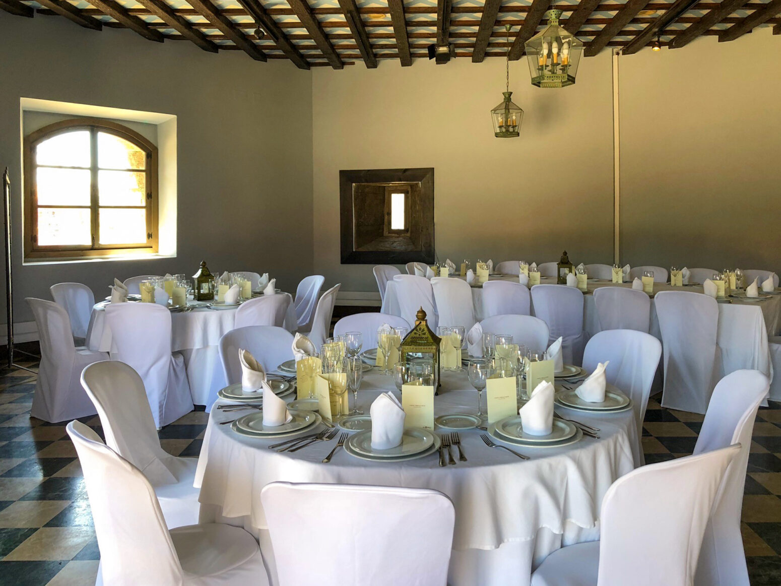 Dispone de un elegante suelo de mármol, techo de vigas de madera y lámparas de forja. Situado en el corazón del parque temático, con acceso desde el exterior del Fuerte.