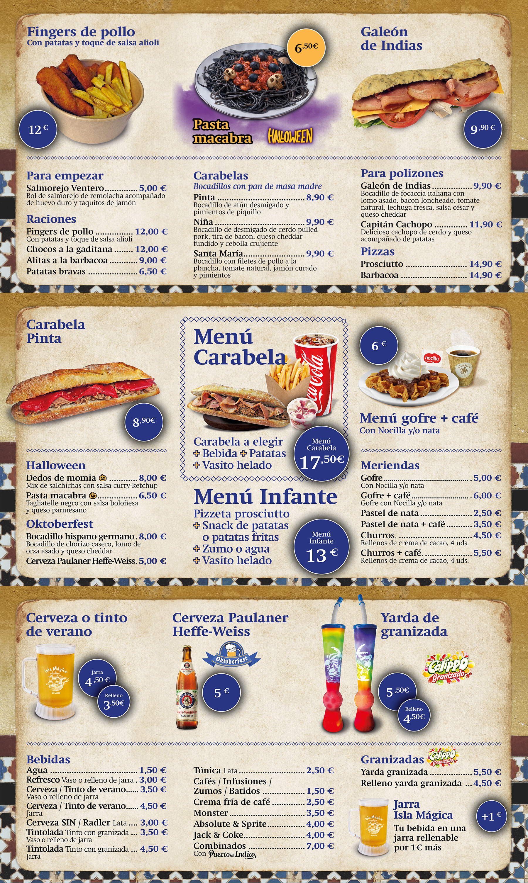 Prueba nuestros exclusivos Grogs: refrescantes bebidas con sabores piratas. Deliciosos churros rellenos de chocolate y menús de bocadillos para llevar. Bar con terraza en plena zona pirata.